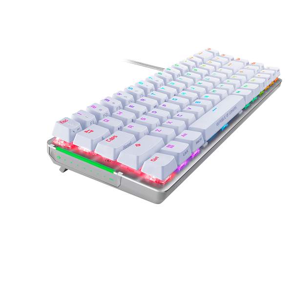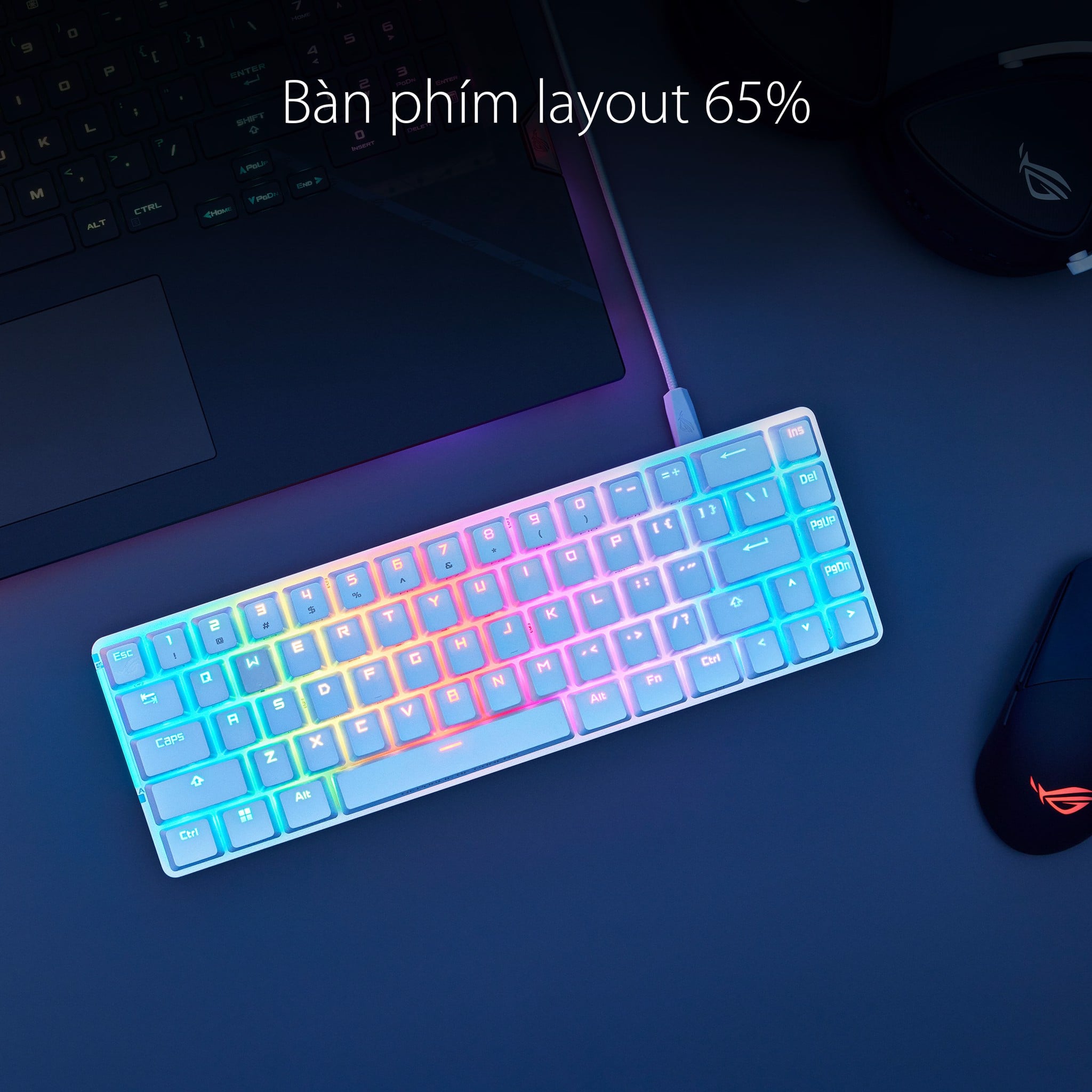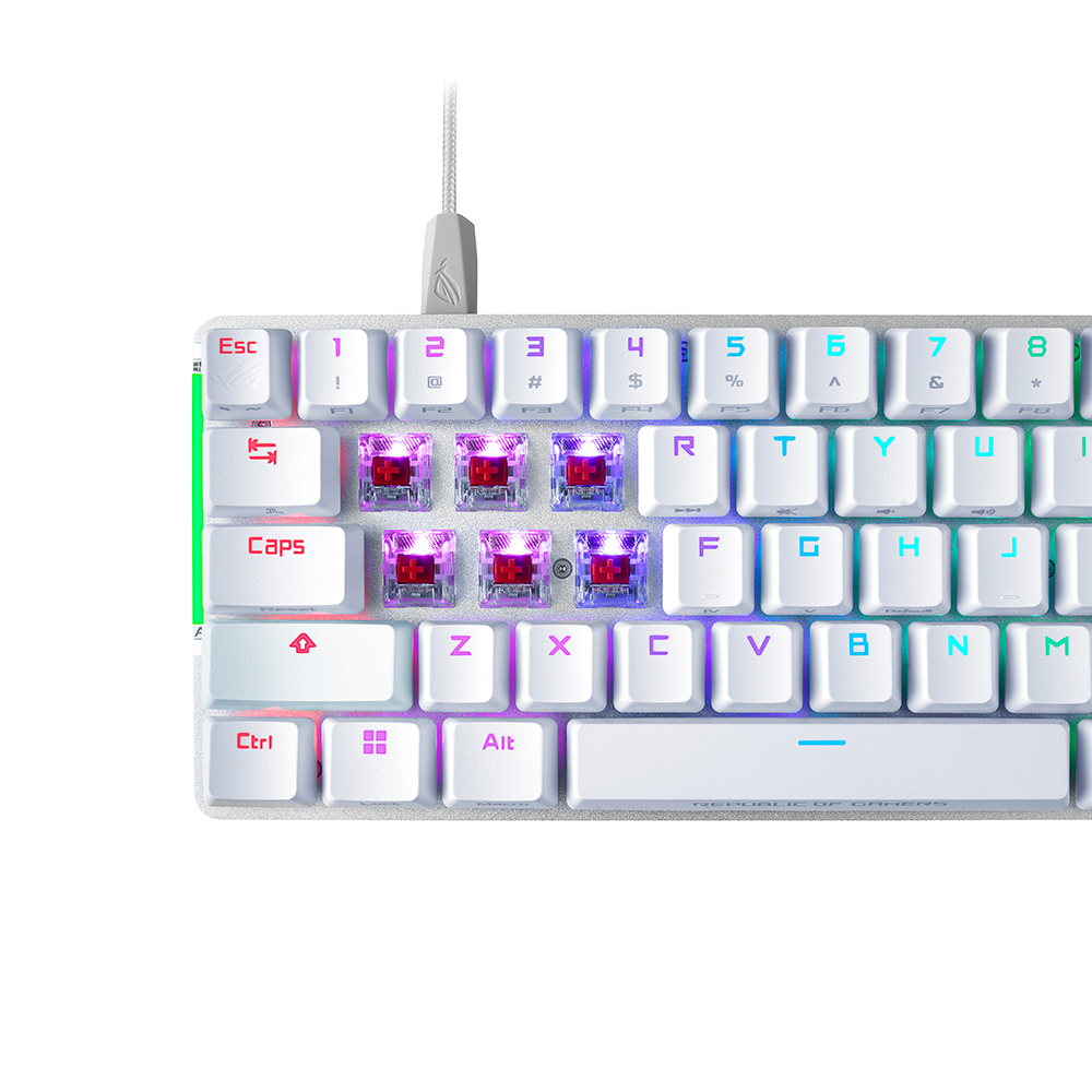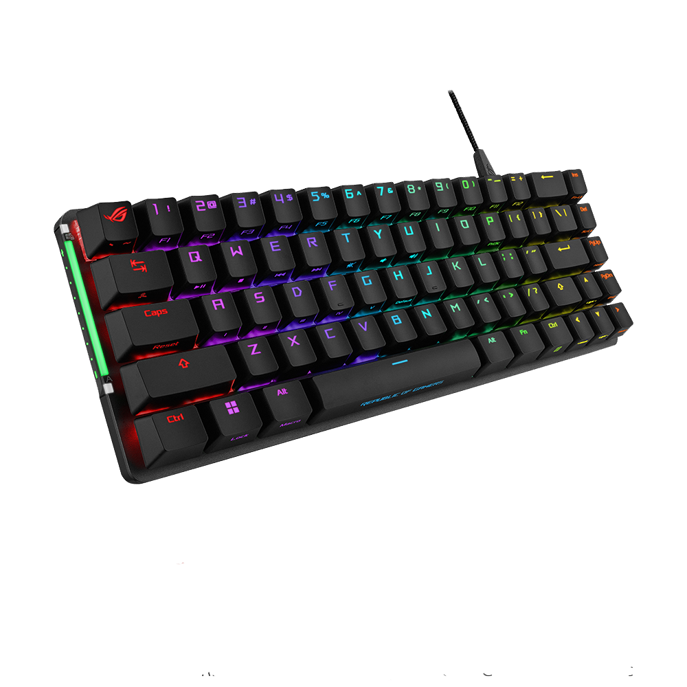 Bàn phím gaming nhỏ gọn ROG Falchion Ace, kích thước 65%, sử dụng các switch cơ ROG NX được bôi trơn sẵn (pre-lubed) với thanh cân bằng stabilizer ROG, keycap PBT doubleshot, foam giảm âm, bảng điều khiển cảm ứng, hai cổng Type-C, điều chỉnh ba góc nghiêng và vỏ bảo vệ