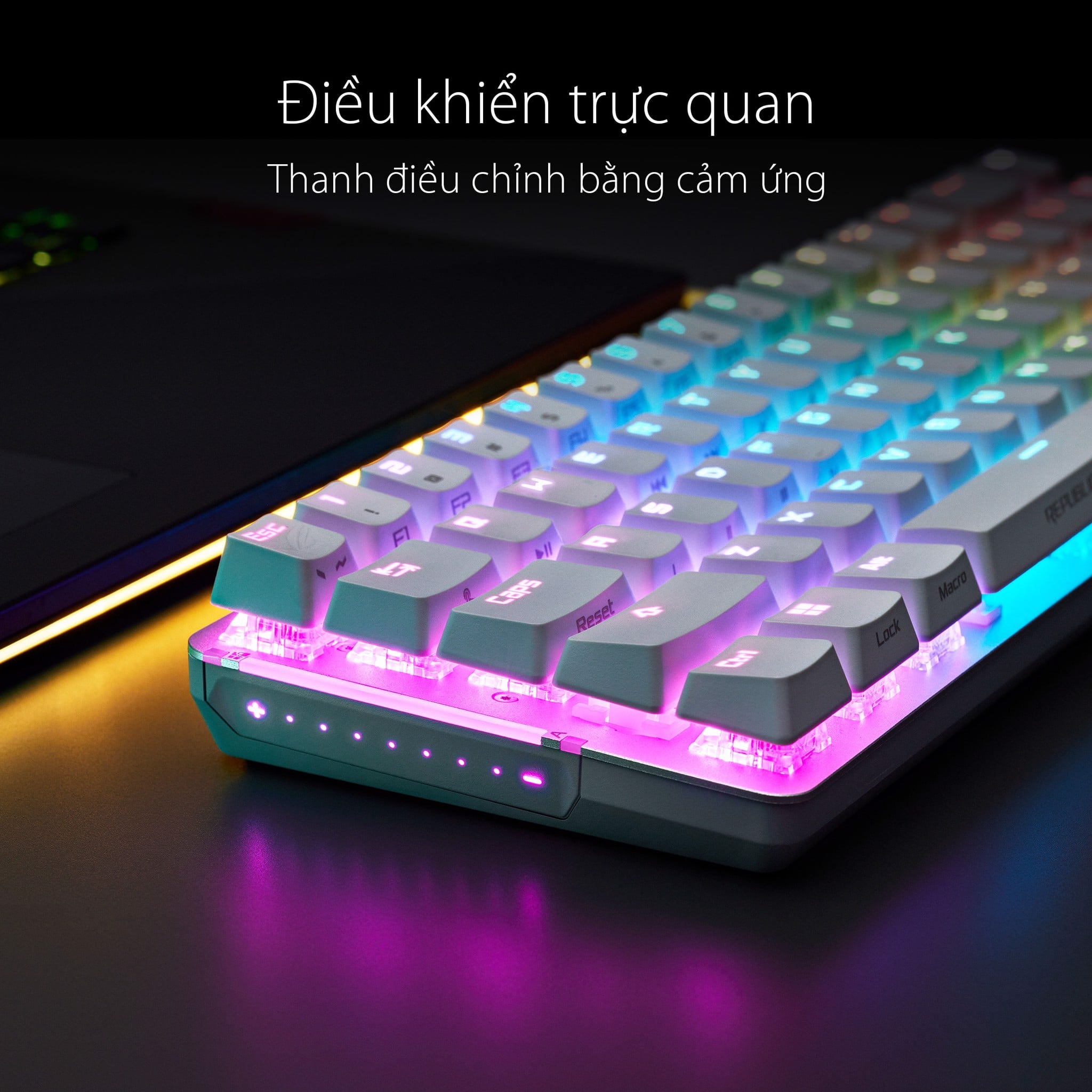 Bảng điều khiển cảm ứng thiết kế sáng tạo ở bên trái của Bàn phím cơ Asus ROG Falchion NX ACE, cho phép bạn điều chỉnh âm lượng một cách thuận tiện hoặc tạo lối tắt để chuyển đổi ứng dụng hay dùng để sao chép và dán. Bảng điều khiển này cũng có thể được lập trình để sử dụng như một phím macro để điều khiển trực quan hơn khi chiến game.