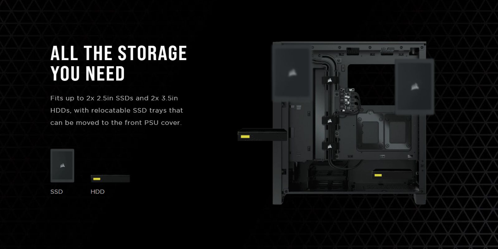 Case Corsair 4000D Airflow White – ATX lắp đặt được tất cả ổ lưu trữ bạn cần. 2 khay 3,5 và 2 khay 2.5 dễ dàng để lắp đặt thêm các ổ lưu trữ.