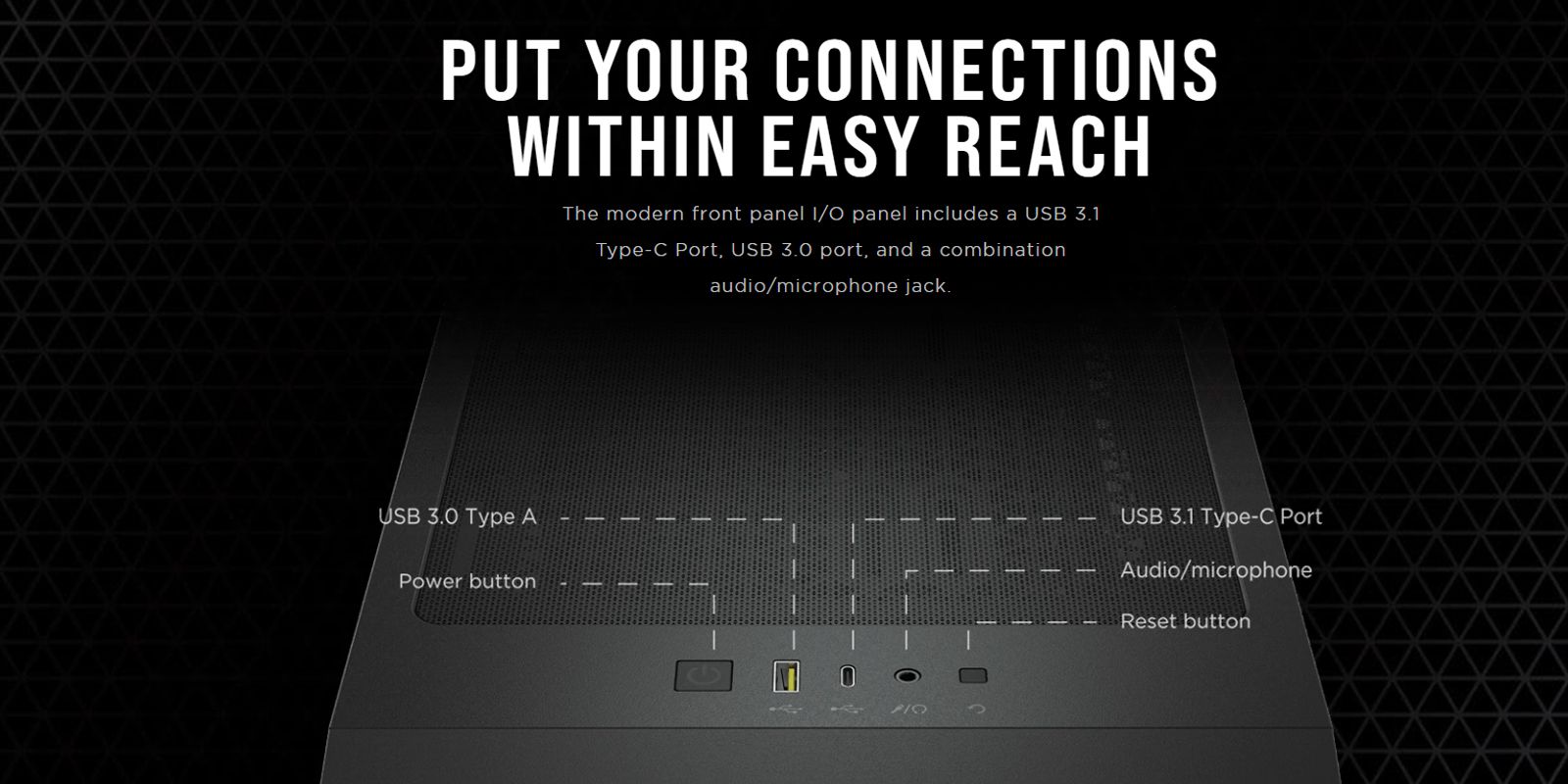 Case Corsair 4000D Airflow White – ATX các cống kết nối hiện đại được đặt ở vị trí thuận tiện để có thể cắm