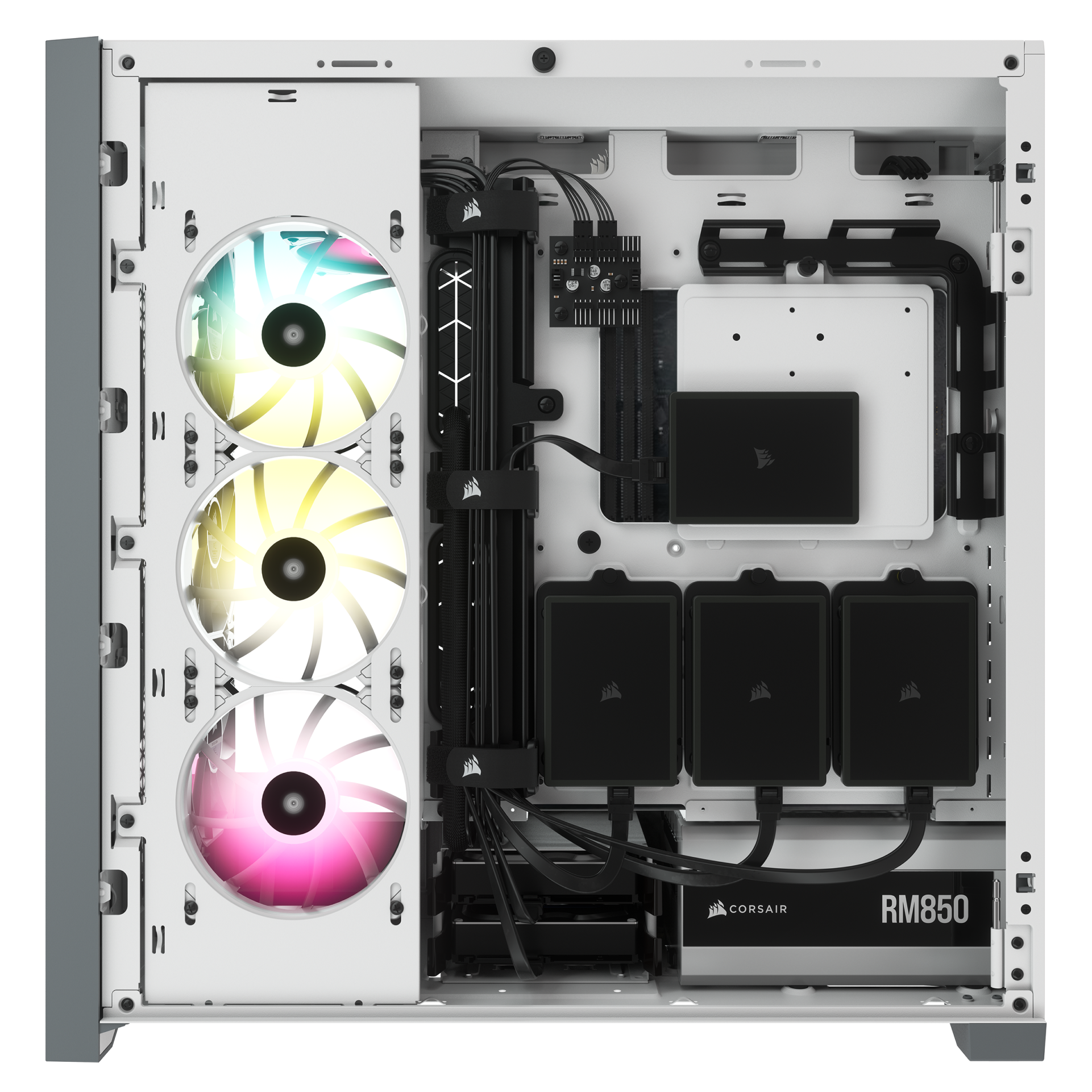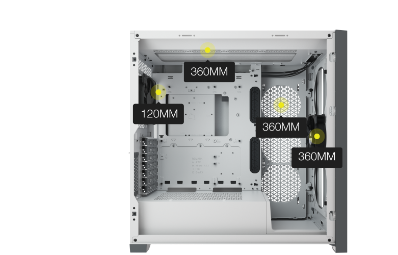 Hỗ trợ lên tới 10 quạt 120mm hoặc 4 quạt 140mm, hỗ trợ radiator 360 ở mặt bên với cấu hình quạt hút thổi. Đi kèm 3 quạt Corsair AF120 RGB ELITE PWM mạnh mẽ và LED cực đẹp.