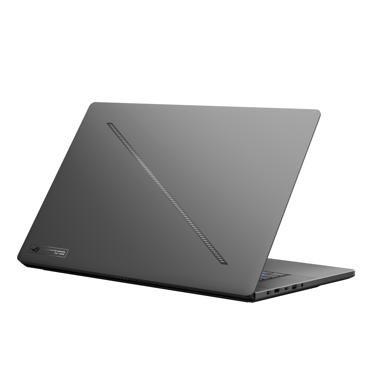 Dải đèn LED chạy chéo trên nắp máy, tạo điểm nhấn đậm chất gaming. Khe tản nhiệt được giấu tinh tế quanh bản lề và mặt đáy, giữ thẩm mỹ tối đa. Bản lề chắc chắn nhưng cho phép mở máy nhẹ nhàng bằng một tay, với giới hạn mở tối đa khoảng 135 độ để không cản trở khe tản nhiệt.