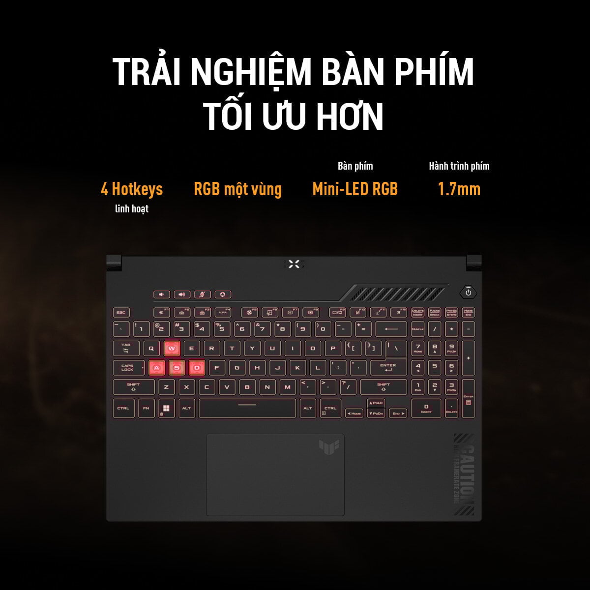 Laptop Gaming Asus TUF A15 FA507NU-LP045W trang bị cho bạn bàn phím kiểu máy tính để bàn tối ưu cho hoạt động chơi game. Đèn nền Mini LED RGB đồng nhất cho phép bạn thể hiện nổi bật phong cách riêng độc đáo của mình, trong khi các phím nổi bật trên bàn phím WASD nổi bật đóng vai trò như một lối tắt trực quan cho các lệnh di chuyển chính với các mẫu chọn lọc cho diện mạo màu khói mới.