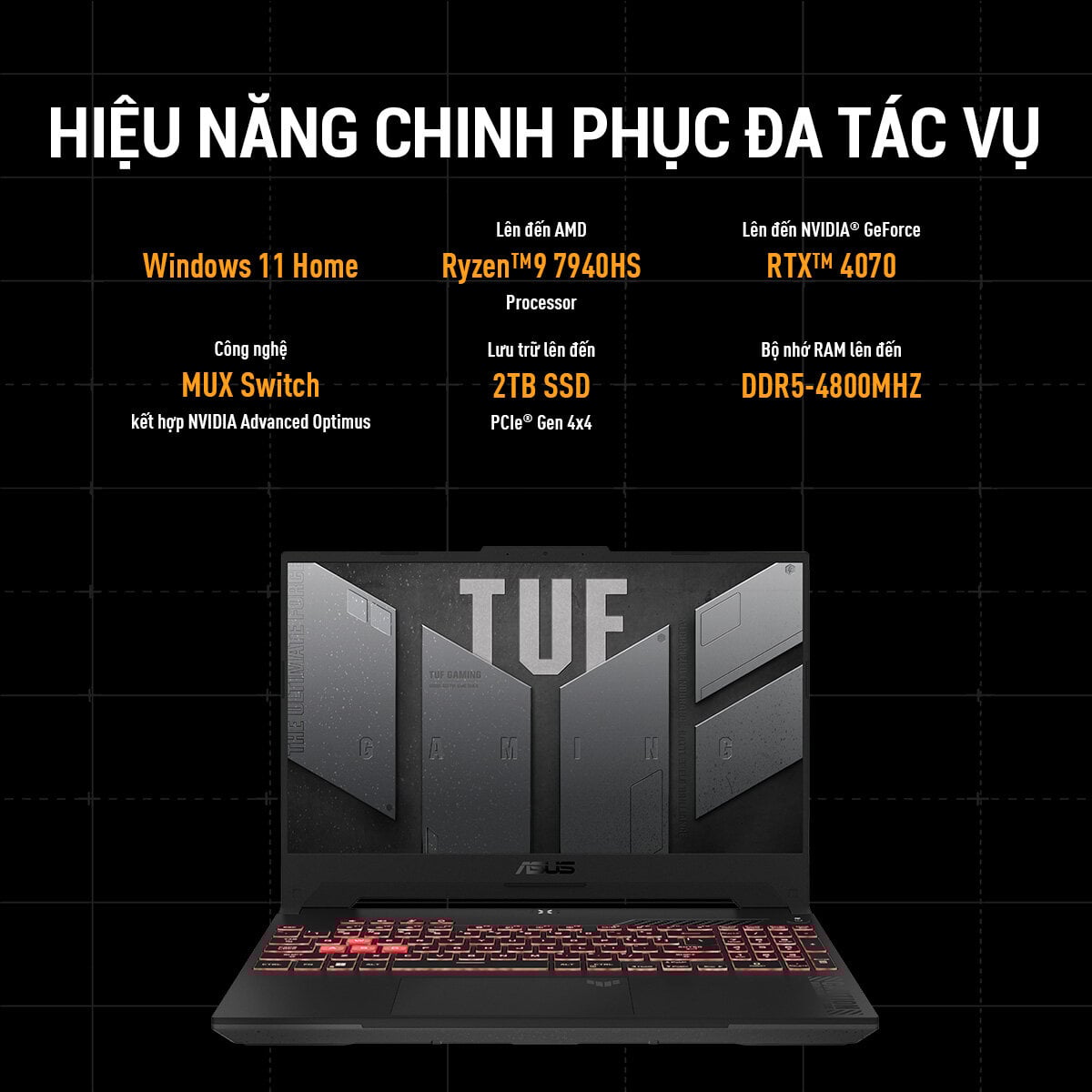 Sẵn sàng chiến mọi tựa game với Laptop Gaming Asus TUF A15 FA507NU-LP045W. Stream game và xử lý đa nhiệm dễ dàng với CPU AMD Ryzen™ 7 7735HS thế hệ thứ 7 và RAM lên đến 16GB RAM DDR5 4800MHz trên nền tảng Windows 11 Home.