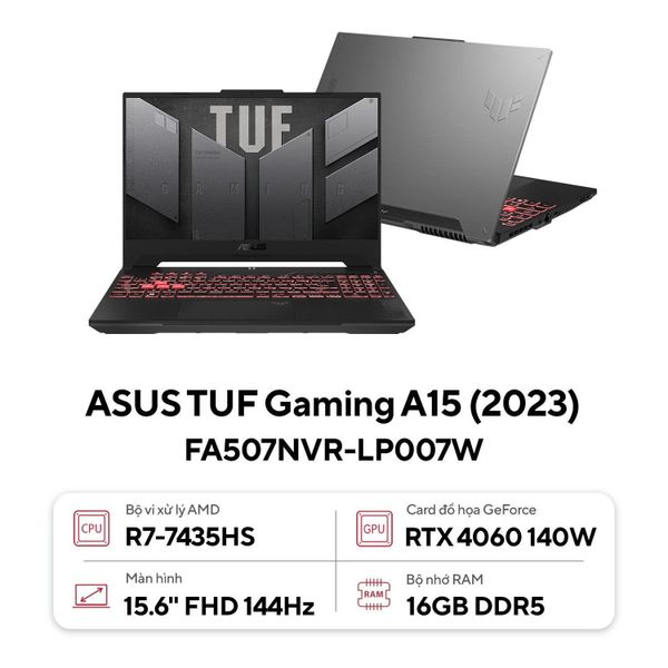 Laptop Gaming Asus TUF A15 FA507NVR LP007W là một trong những siêu phẩm laptop gaming với thiết kế đẳng cấp vẻ ngoài sang trọng, cấu hình vượt trội, màn hình sống động tươi mới cùng giá bán 25,990,000₫ phù hợp với nhiều phân khúc khách hàng. Hứa hẹn mang lại cho các gamer trải nghiệm sử dụng ấn tượng ấn.
