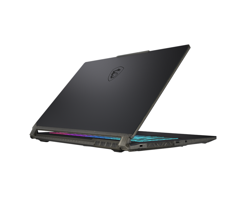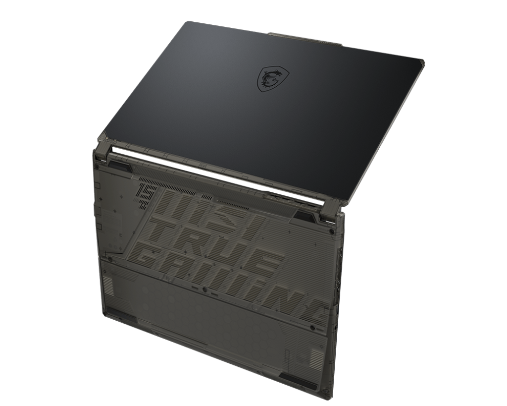Laptop Gaming MSI Cyborg 15 AI A1VEK 245VN có thiết kế cyberpunk ấn tượng với khung bán trong suốt. Màu Translucent Black tạo vẻ ngoài tương lai, khác biệt hoàn toàn. Các chi tiết đèn RGB tạo điểm nhấn, thể hiện phong cách cá nhân. Logo MSI phát sáng trên nắp máy, thu hút mọi ánh nhìn.