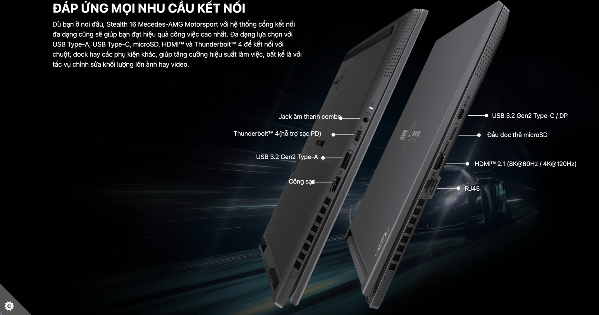 Dù bạn ở nơi đâu, Stealth 16 Mecedes-AMG Motorsport với hệ thống cổng kết nối đa dạng cũng sẽ giúp bạn đạt hiệu quả công việc cao nhất. Đa dạng lựa chọn với USB Type-A, USB Type-C, microSD, HDMI™ và Thunderbolt™ 4 để kết nối với chuột, dock hay các phụ kiện khác, giúp tăng cường hiệu suất làm việc, bất kể là với tác vụ chỉnh sửa khối lượng lớn ảnh hay video.