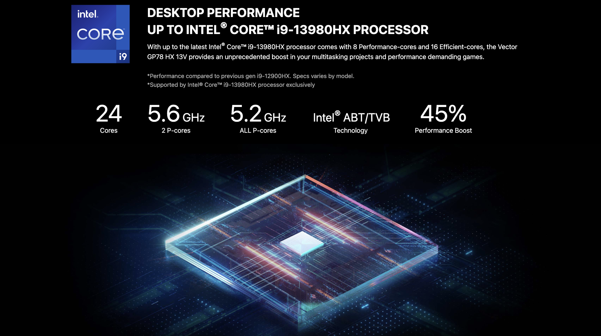 Laptop Gaming MSI Vector GP78 HX 13VI-476VN có thể được trang bị lên đến bộ xử lý Intel® Core™ i9 thế hệ thứ 13, xây dựng trên kiến trúc lõi lai cải tiến, 8 lõi Hiệu suất và 16 lõi Hiệu quả, giúp xử lý đa nhiệm tốt hơn và chạy các trò chơi đòi hỏi khắt khe.
