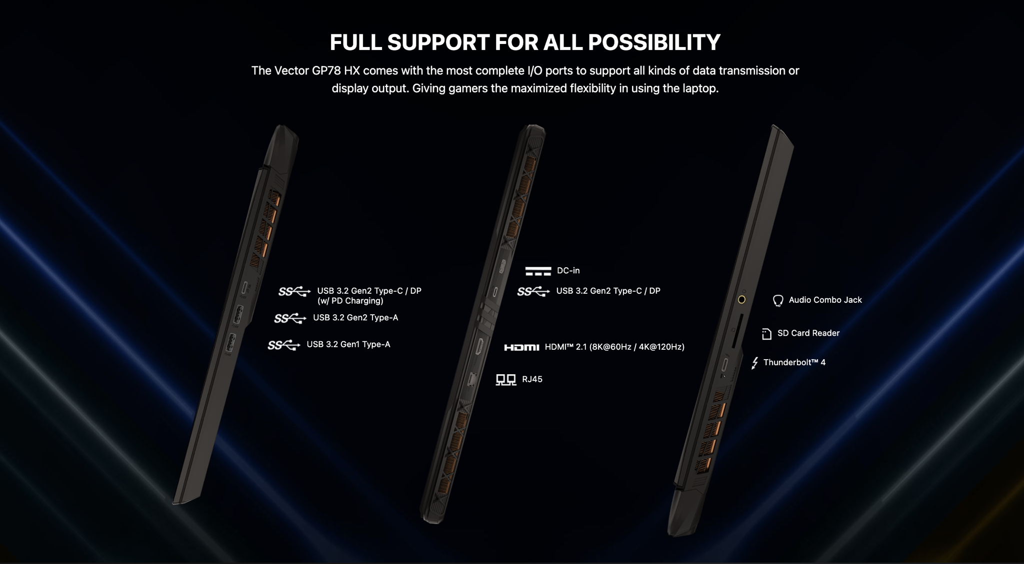 MSI Vector GP77 HX 13VG trang bị đầy đủ cổng kết nối với các cổng mini DP, 3x USB-A, USB-C (w PD and DP), HDMI 2.1, cổng LAN, jack 3.5mm.