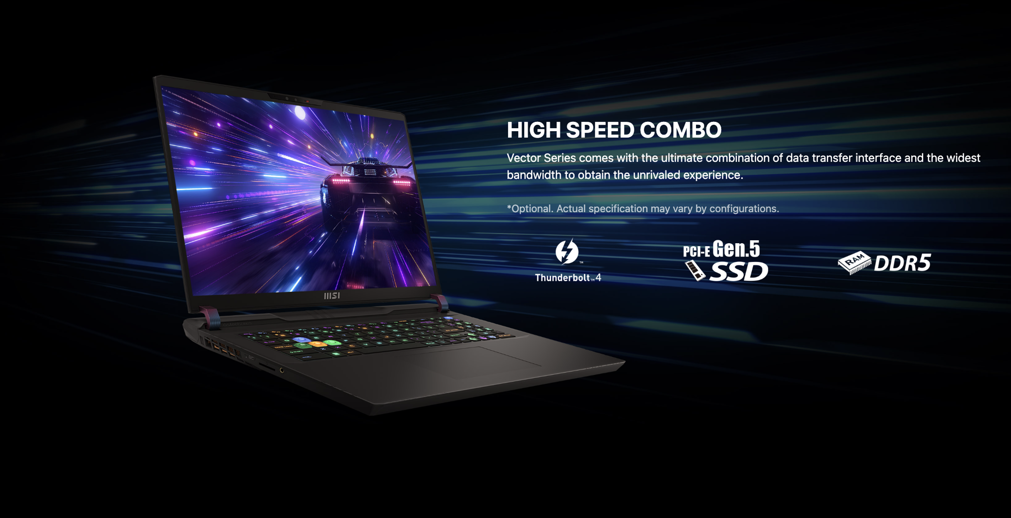 Laptop Gaming MSI Vector GP78 HX 13VI-476VN trang bị ram DDR5 và SSD Gen 4x4 cho sự kết hợp hoàn hảo giữa giao diện truyền dữ liệu và băng thông rộng nhất cho trải nghiệm vô song.
