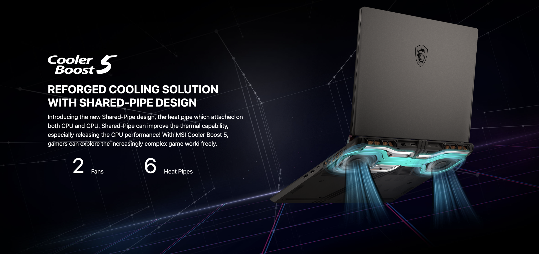 Thiết kế Shared-Pipe mới, ống dẫn nhiệt gắn trên cả CPU và GPU. Shared-Pipe có thể cải thiện khả năng tản nhiệt nhanh chóng, đặc biệt là giải phóng hiệu năng của CPU. Với MSI Cooler Boost 5, game thủ có thể tự do khám phá thế giới trò chơi ngày càng phức tạp trên Laptop Gaming MSI Vector GP78 HX 13VI-476VN.
