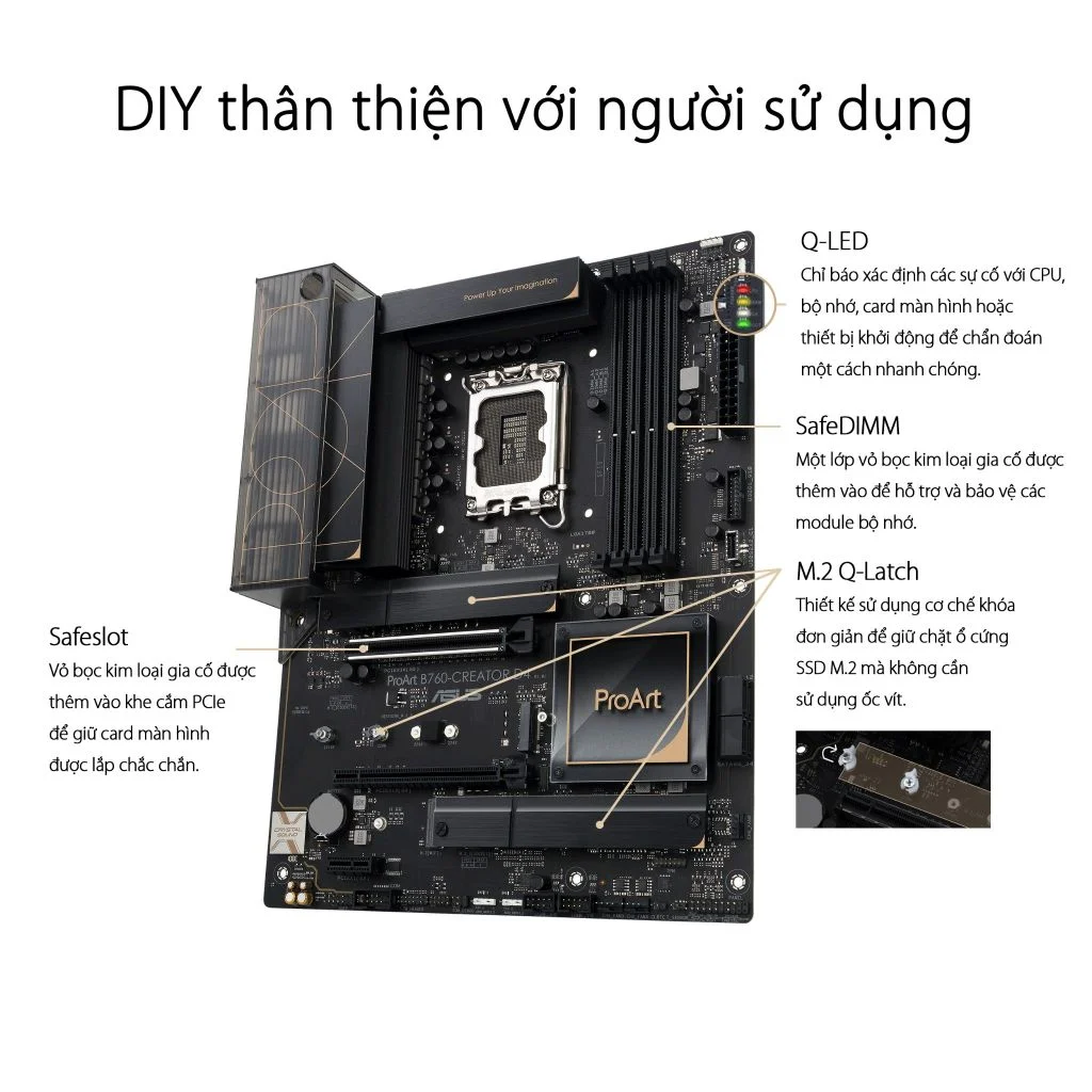 - Chipset Intel B760 và socket LGA100, main Asus ProArt B760-CREATOR mang lại sự linh hoạt và hiệu suất cao cho các nhiệm vụ đồi hỏi sự sáng tạo
