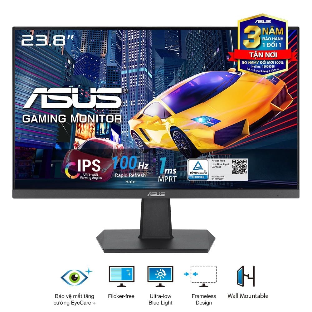 Màn Hình ASUS VA24EHF (24"/ Full HD/ IPS/ 1ms MPRT/ 100Hz) - 24 inch (23.8 inch hiển thị), IPS, Full HD, viền mỏng, 100Hz, Adaptive-Sync, 1ms MPRT, HDMI, ánh sáng xanh thấp, khử nhấp nháy, có thể treo tường