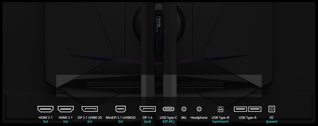 | Cổng kết nối | 2 x HDMI 2.1, 1 x DP 2.1 UHBR20, 1 x MiniDP 2.1 UHBR20, 1 x DP 1.4 (HBR3) Out, 1 x USB-C (Alt Mode, PD 18W), 2 x USB 3.2 Downstream, 1 x USB 3.2 Upstream, 1 x Jack tai nghe, 1 x Jack micro |