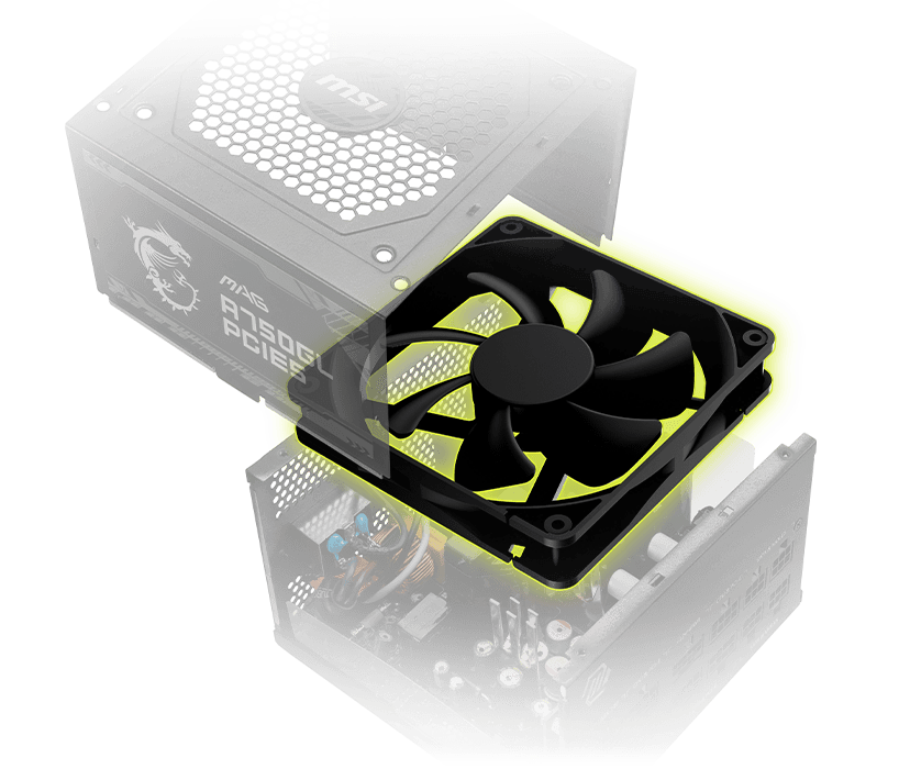 Quạt của Nguồn MSI MAG A750GL PCIE5 750W 80 Plus Gold Fully Modular sở hữu vòng bi fluid dynamic, được sử dụng để tăng cường thời gian hoạt động của quạt trong khi vẫn giữ được độ ồn thấp.