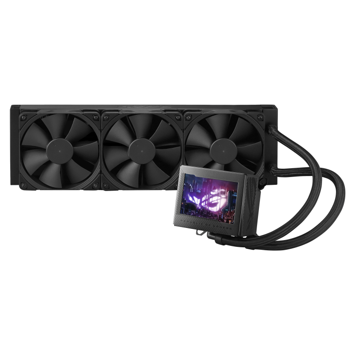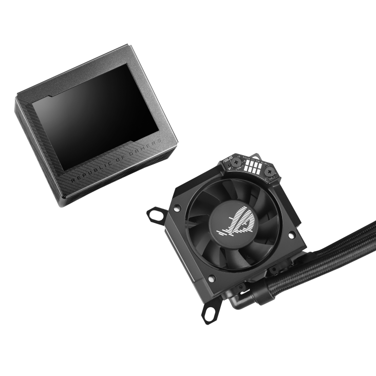 - Phần mềm Armoury Crate cung cấp hoàn toàn quyền điều chỉnh tốc độ bơm, quạt tích hợp và quạt tản nhiệt, và cho phép hiển thị GIF và thống kê hệ thống trên màn hình LCD.
