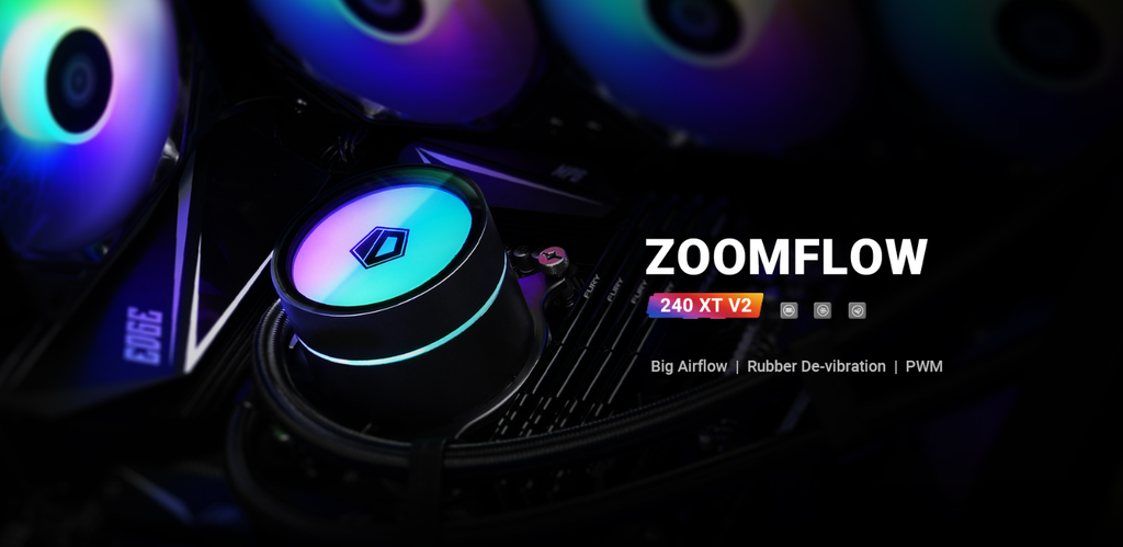 ID-COOLING ZOOMFLOW 240 XT V2 là bộ tản nhiệt nước AIO hiệu năng cao với radiator nhôm 240mm và 2 quạt ARGB 120mm tốc độ 500–1800RPM, lưu lượng gió tối đa 82.5CFM, áp suất tĩnh 2.55mmH₂O, độ ồn thấp chỉ 35.2dB(A).
