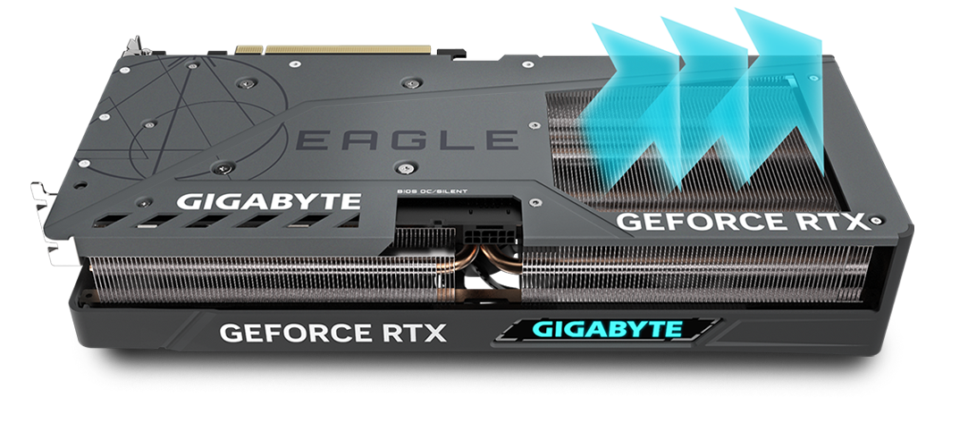 2 quạt ngoài trên VGA Gigabyte GeForce RTX 4070 Ti Eagle OC 12GBsẽ được quay đảo chiều so với chiếc ở giữa, nhằm tạo luồng khí mạnh mẽ hơn, khả năng tản nhiệt mạnh mẽ hơn, tản nhiệt nhanh hơn.