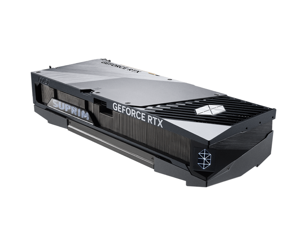 Lấy cảm hứng từ thiết kế kim cương, RTX 5080 16G SUPRIM SOC sở hữu ngoại hình mạnh mẽ với các chi tiết vân xước, mặt cắt tam giác tinh xảo.